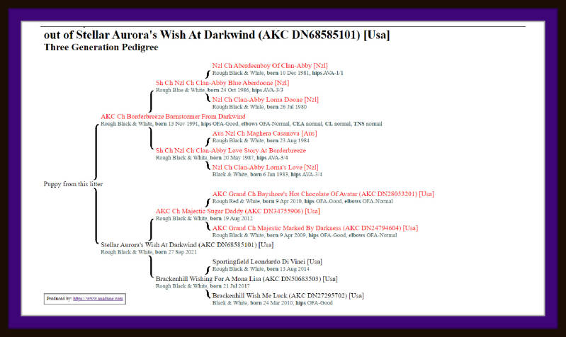Our next litter is planned for the Autumn or Winter of 2023. We plan to use frozen semen from our Barney (Ch. Borderbreeze Barnstormer From Darkwind) on Tulane (Stellar Aurora's Wish of Darkwind). Though Barney carries the blue gene we are not expecting color.